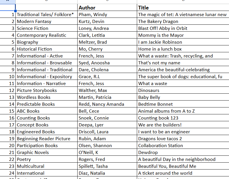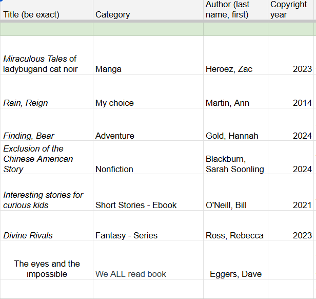 I completed a reading log focused on young adult and children’s literature. The books I chose reflect a diverse, up-to-date collection, with titles from 2019 and newer so I can better recommend them to students. Being familiar with the books in the library will help me encourage students to read both for learning and for enjoyment.