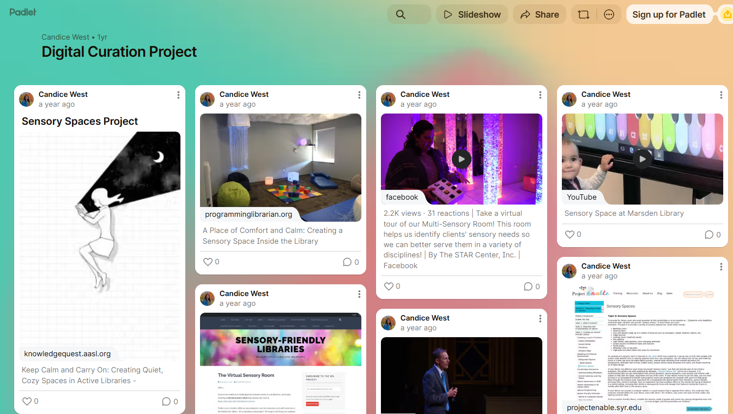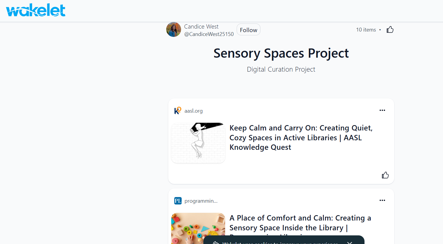In SLIB 600, I completed a digital curation project focused on sensory spaces for elementary students. This project explored why this type of information is important and where to find it. The curation sites will be a helpful place for me to go back to when I’m looking for articles and ideas to create my own sensory space.